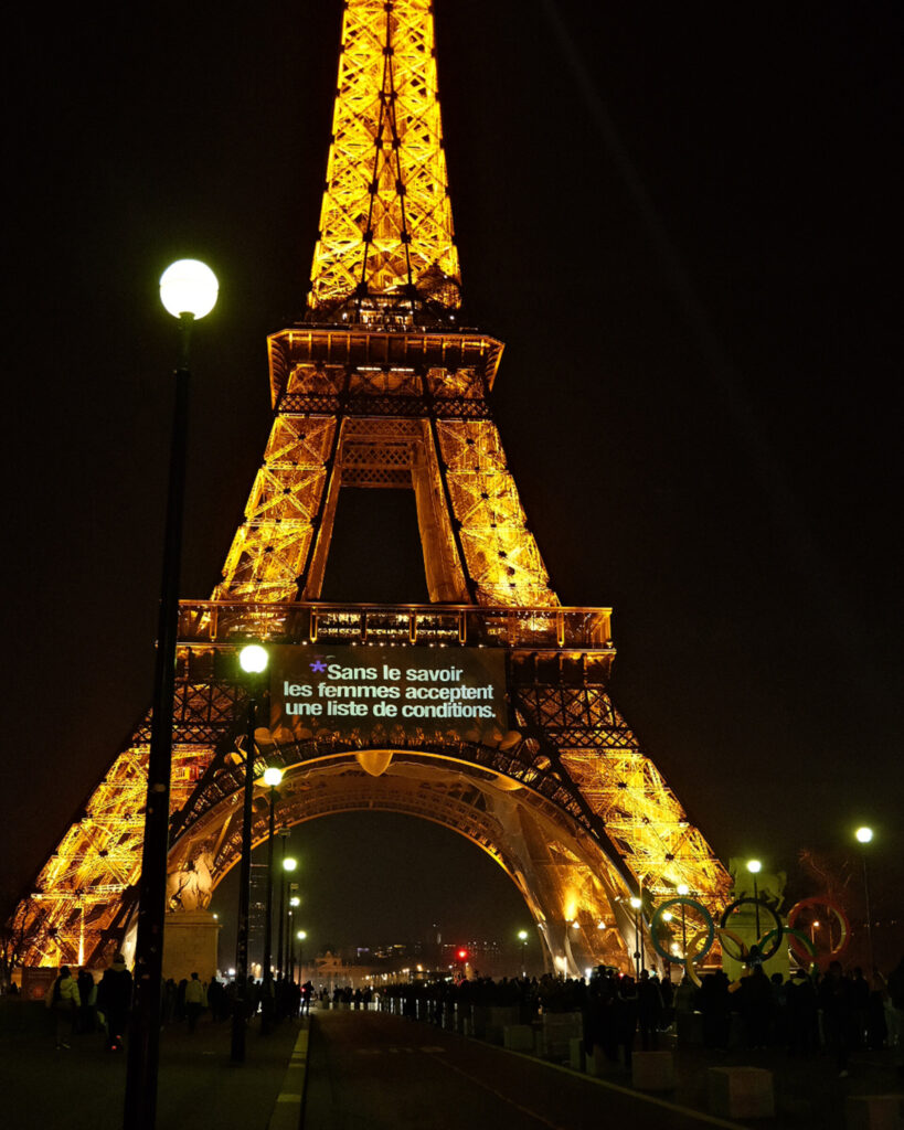 La ejecución acompaña. Torre Eiffel, 8 de marzo, despliegue urbano. La campaña gana visibilidad, se entiende rápido y circula en los espacios previstos. Funciona como pieza.